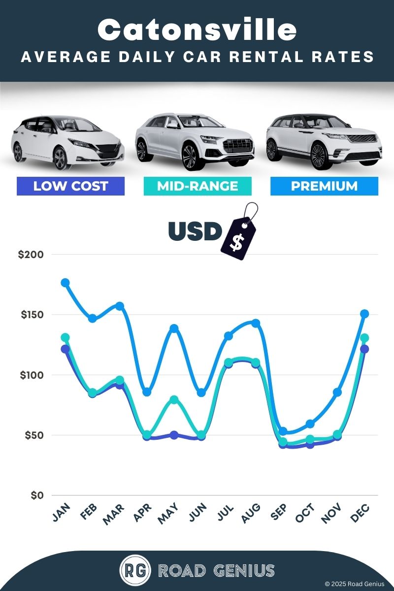 On average, car rentals in Catonsville cost around $92 per day, with the lowest-priced rentals starting at $42 per day.