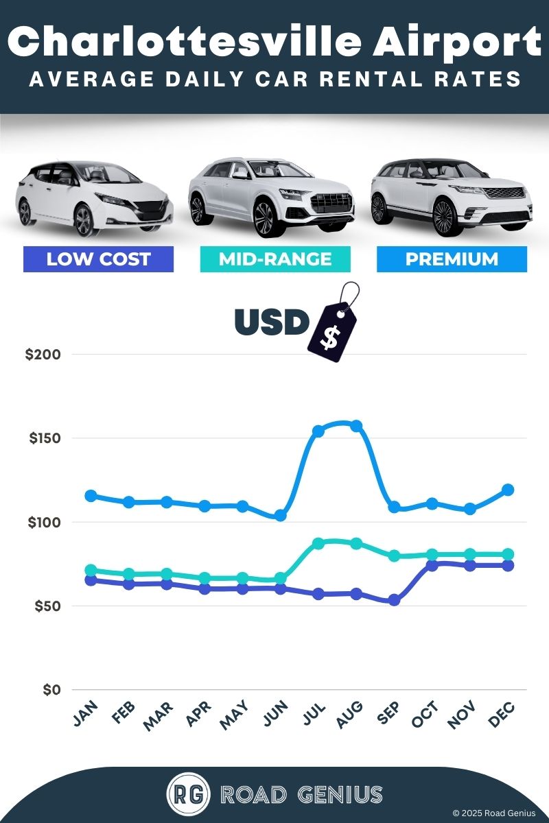 On average, car rentals at Charlottesville Airport cost around $86 per day, with the lowest-priced rentals starting at $54 per day.