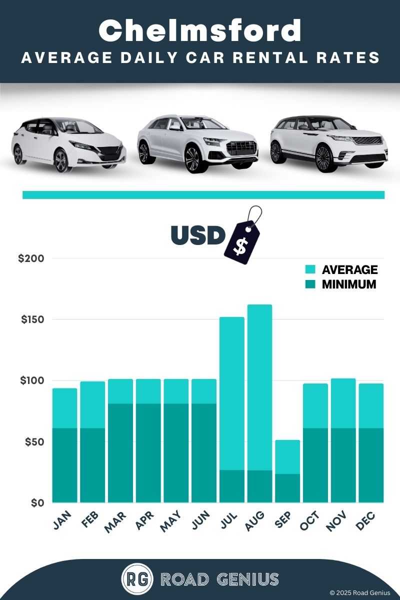On average, car rentals in Chelmsford cost around $91 per day, with the lowest-priced rentals starting at $23 per day.