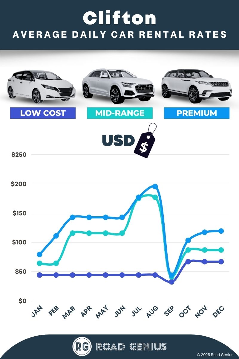 On average, car rentals in Clifton cost around $93 per day, with the lowest-priced rentals starting at $32 per day.