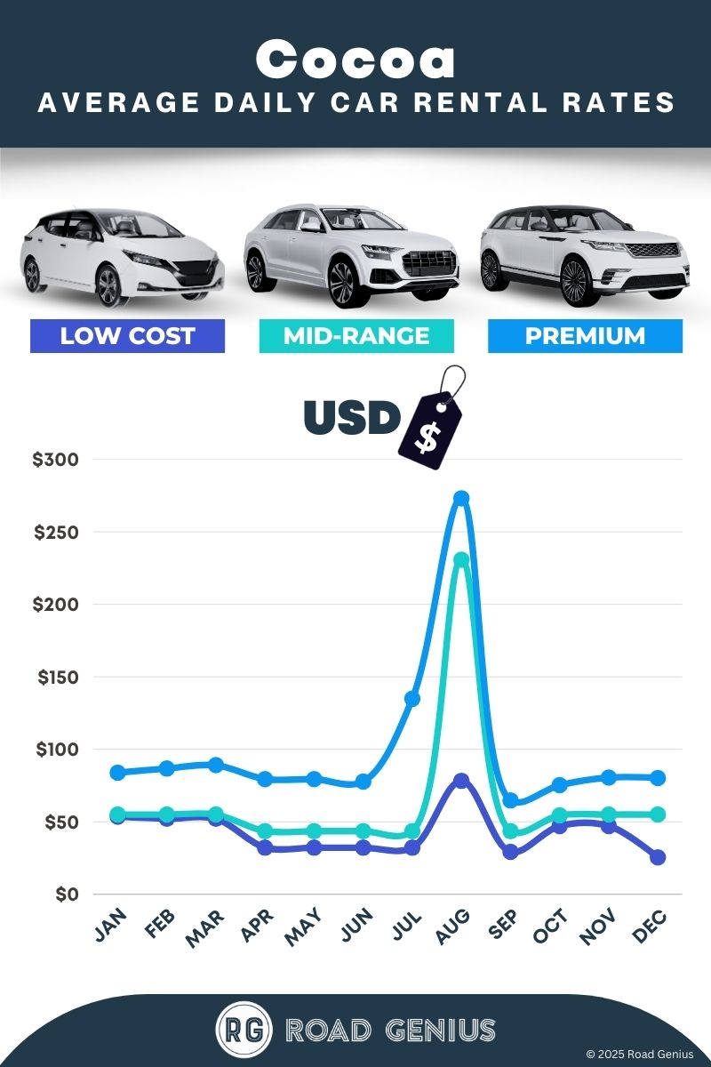 On average, car rentals in Cocoa cost around $69 per day, with the lowest-priced rentals starting at $25 per day.