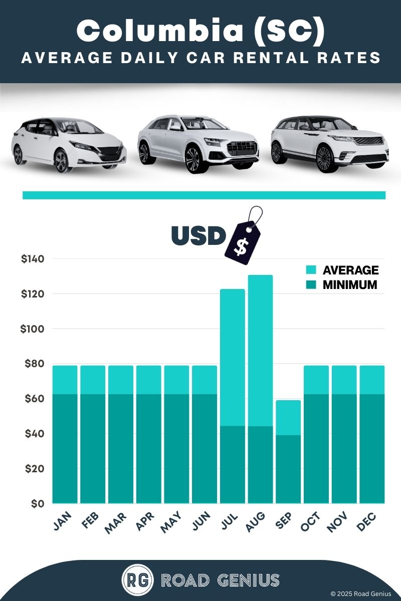 On average, car rentals in Columbia (SC) cost around $73 per day, with the lowest-priced rentals starting at $39 per day.