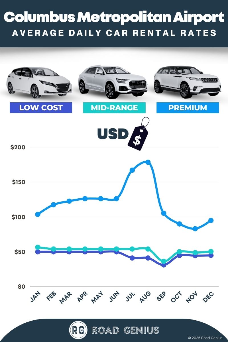 On average, car rentals at Columbus Metropolitan Airport cost around $72 per day, with the lowest-priced rentals starting at $31 per day.