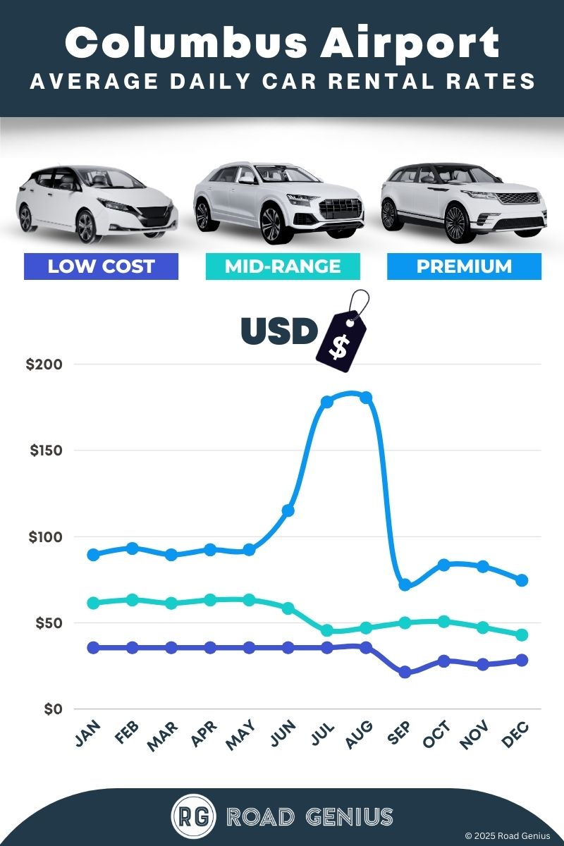 On average, car rentals at Columbus Airport cost around $63 per day, with the lowest-priced rentals starting at $21 per day.