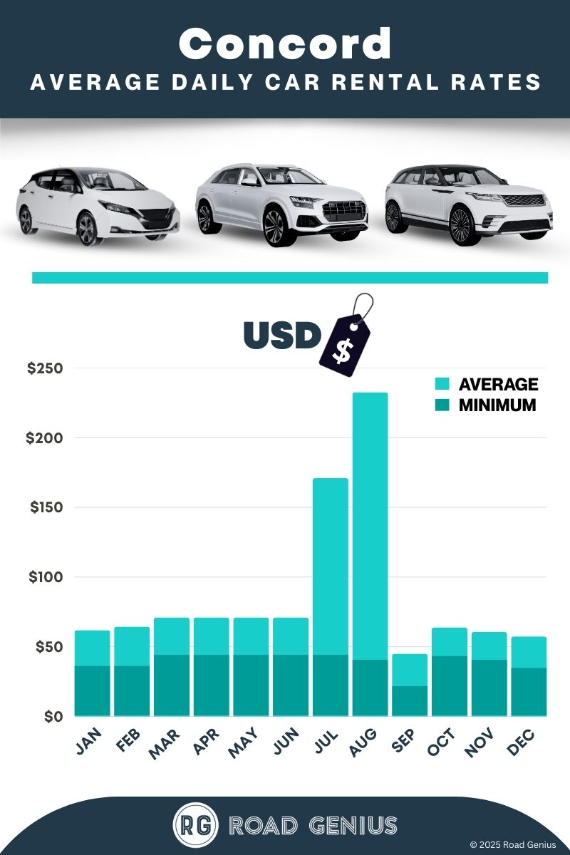 On average, car rentals in Concord cost around $53 per day, with the lowest-priced rentals starting at $36 per day.