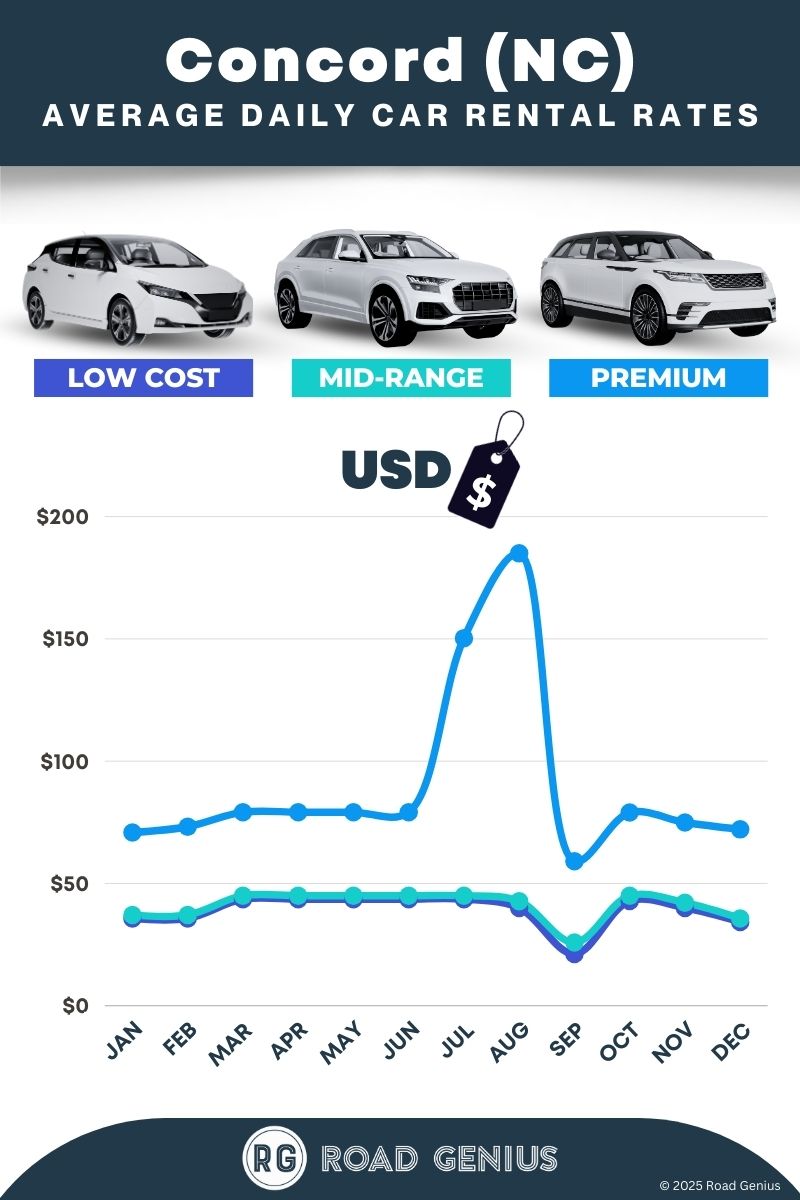 On average, car rentals in Concord (NC) cost around $57 per day, with the lowest-priced rentals starting at $21 per day.