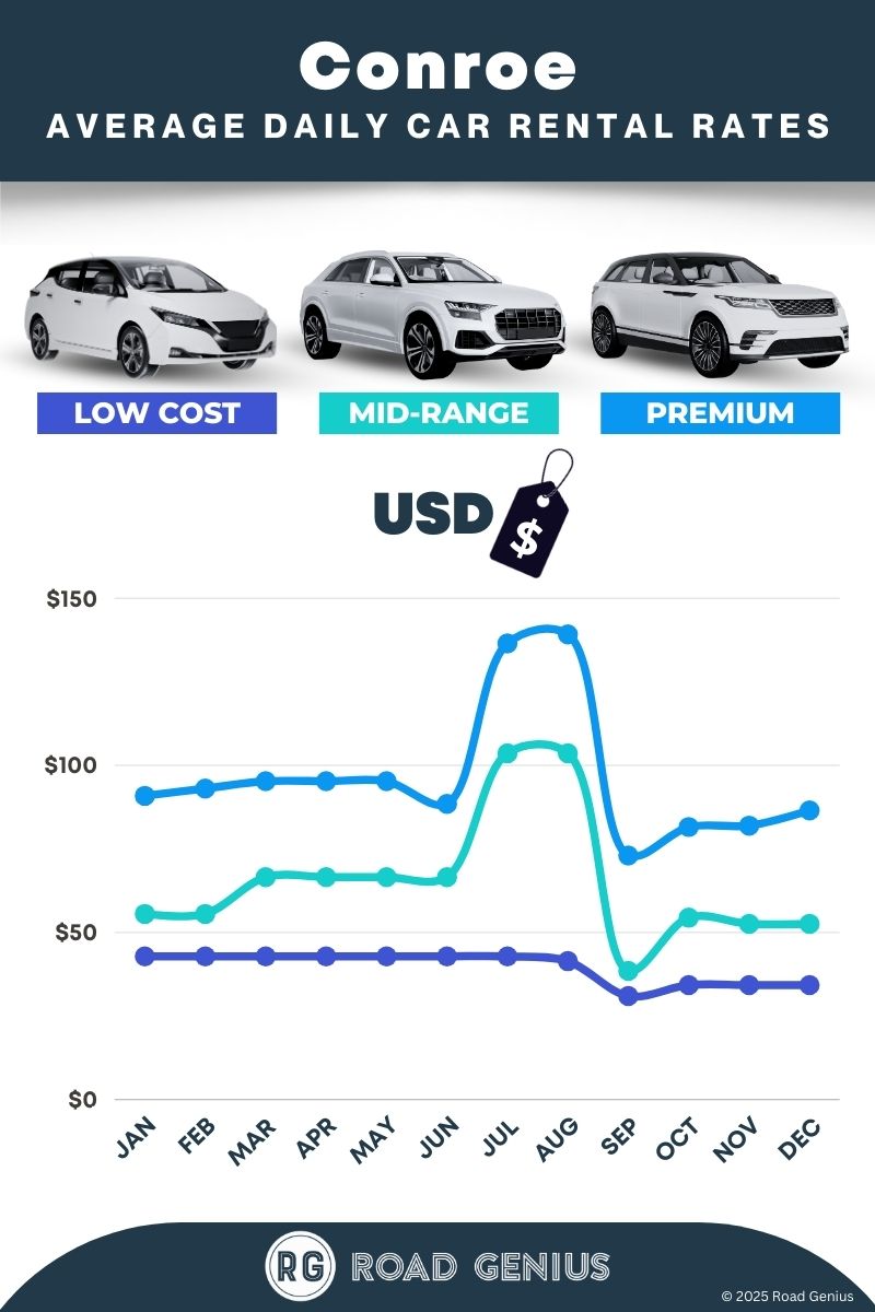 On average, car rentals in Conroe cost around $67 per day, with the lowest-priced rentals starting at $31 per day.