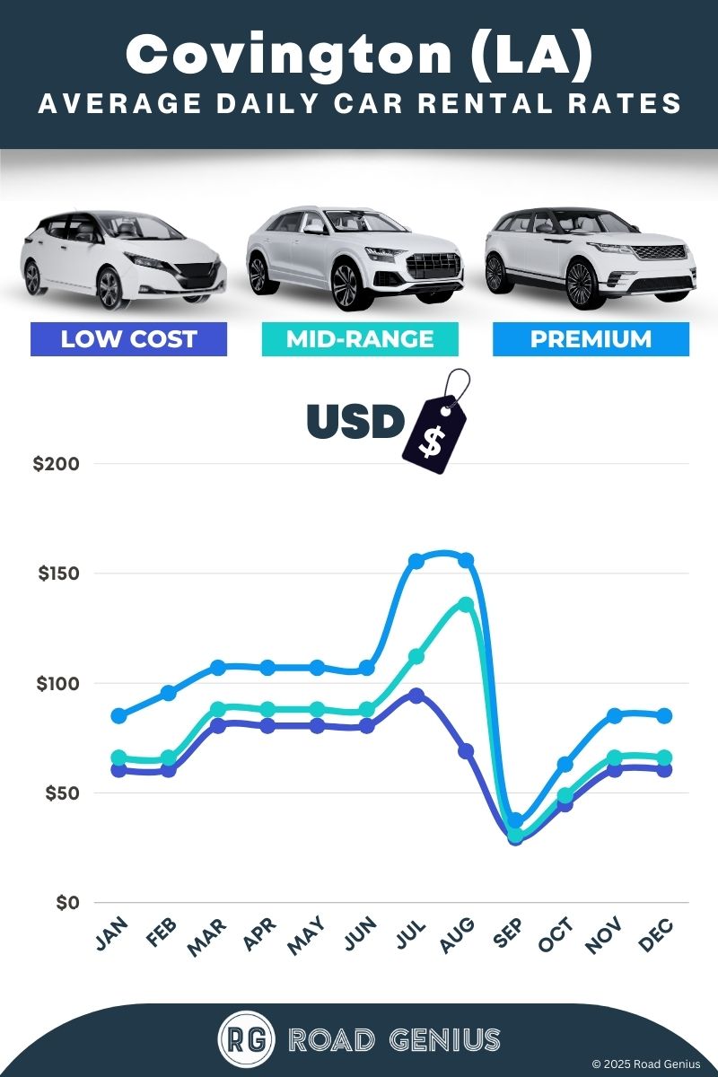On average, car rentals in Covington (LA) cost around $82 per day, with the lowest-priced rentals starting at $29 per day.