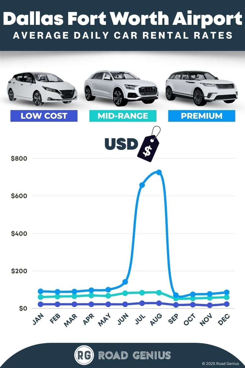 On average, car rentals at Dallas Fort Worth Airport cost around $94 per day, with the lowest-priced rentals starting at $17 per day.