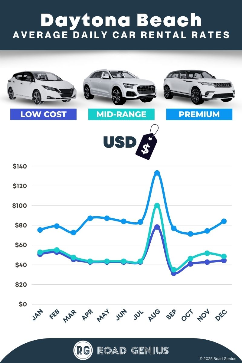On average, car rentals in Daytona Beach cost around $60 per day, with the lowest-priced rentals starting at $31 per day.