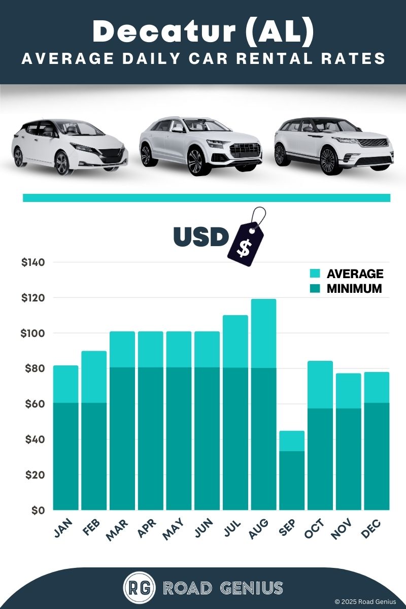 On average, car rentals in Decatur (AL) cost around $86 per day, with the lowest-priced rentals starting at $33 per day.