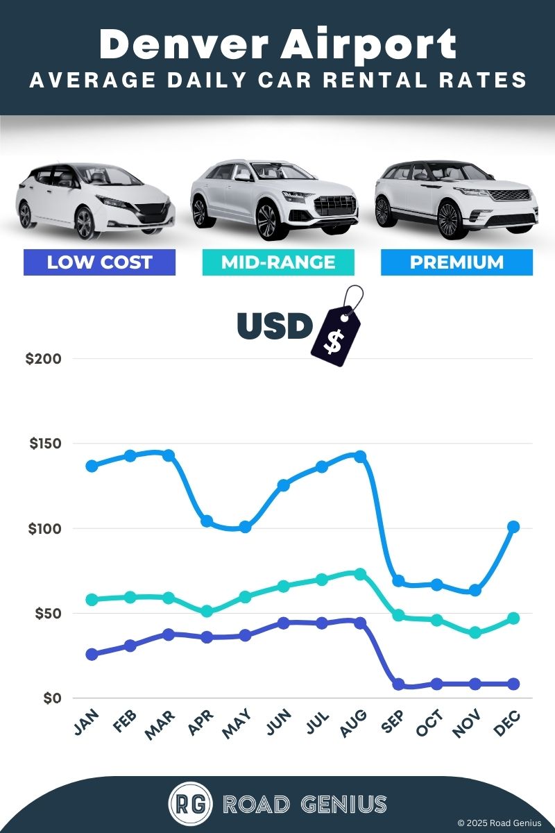 On average, car rentals at Denver Airport cost around USD $74 per day, with the lowest-priced rentals available from USD $12 per day.