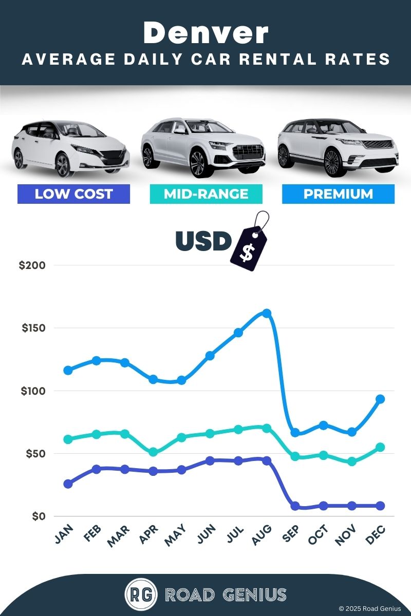 On average, car rentals in Denver cost around USD $73 per day, with the lowest-priced rentals available from USD $13 per day.