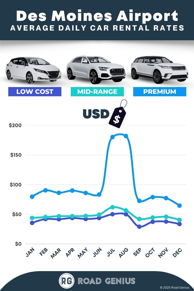 On average, car rentals at Des Moines Airport cost around $62 per day, with the lowest-priced rentals starting at $29 per day.