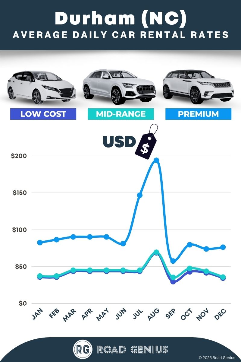 On average, car rentals in Durham (NC) cost around $61 per day, with the lowest-priced rentals starting at $29 per day.