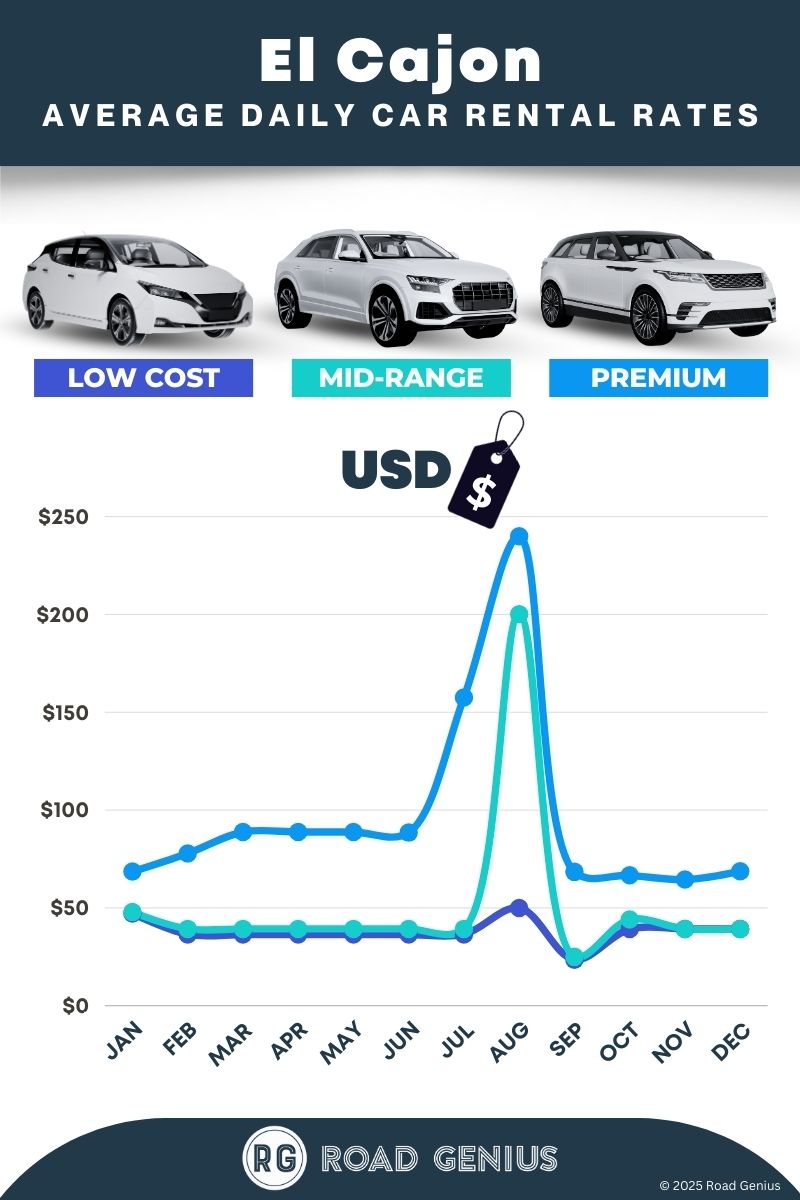 On average, car rentals in El Cajon cost around $63 per day, with the lowest-priced rentals starting at $24 per day.
