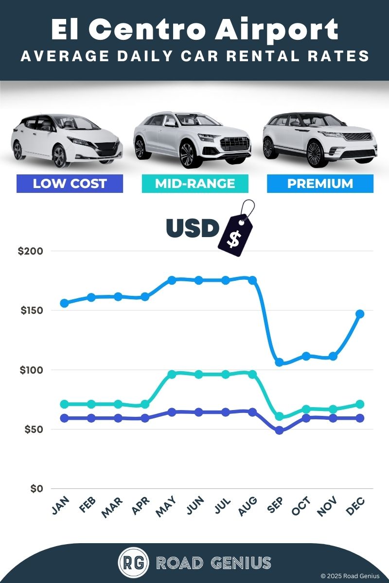 On average, car rentals at El Centro Airport cost around $96 per day, with the lowest-priced rentals starting at $49 per day.