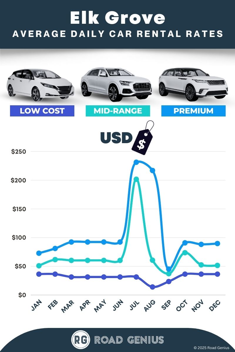 On average, car rentals in Elk Grove cost around $69 per day, with the lowest-priced rentals starting at $14 per day.