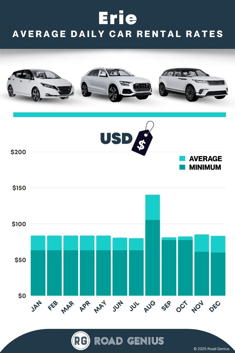 On average, car rentals in Erie cost around $79 per day, with the lowest-priced rentals starting at $60 per day.