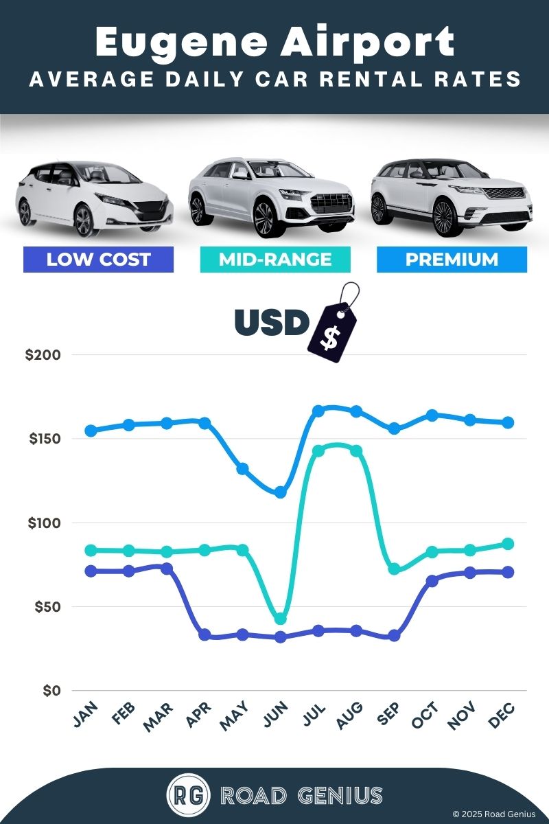 On average, car rentals at Eugene Airport cost around $99 per day, with the lowest-priced rentals starting at $32 per day.