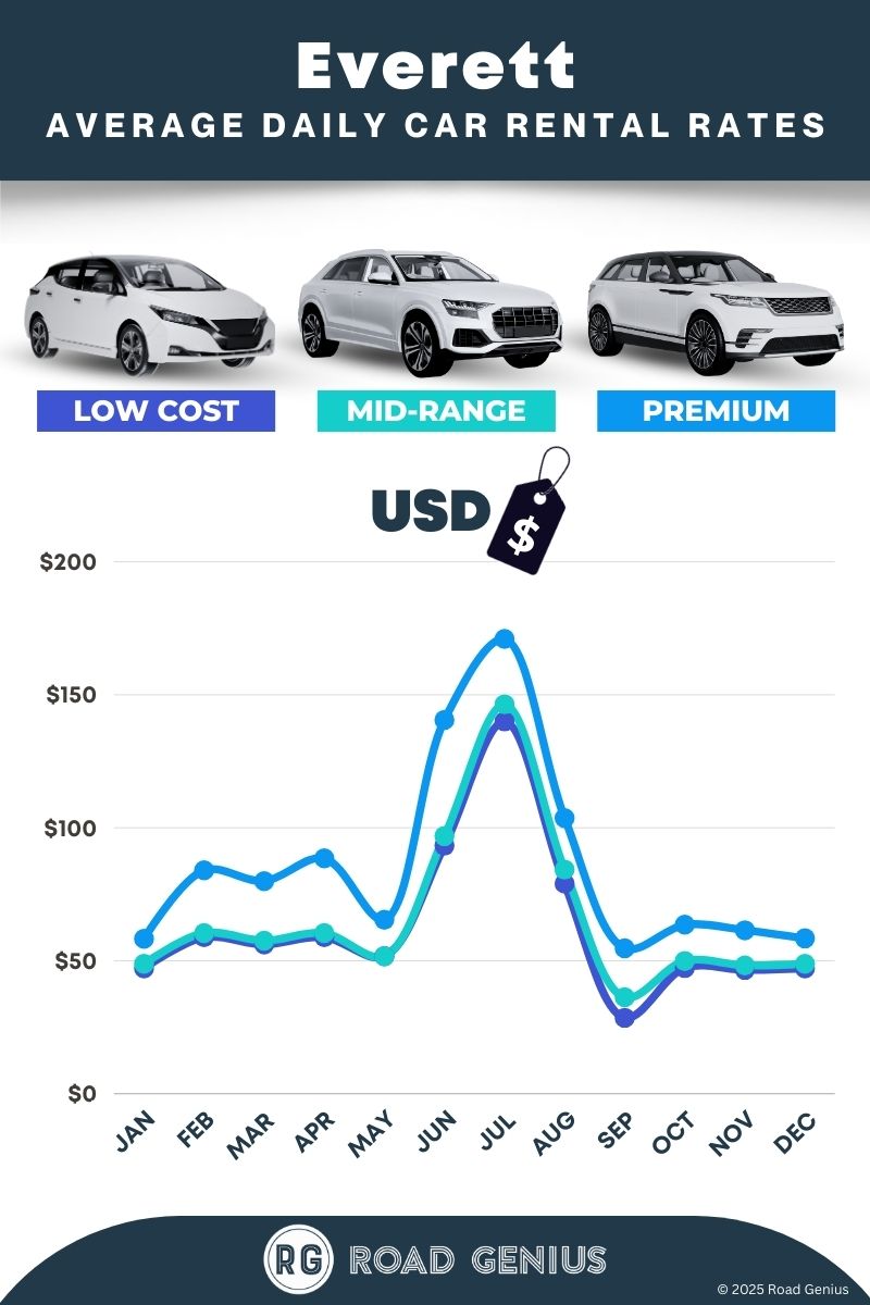 On average, car rentals in Everett cost around $71 per day, with the lowest-priced rentals starting at $29 per day.