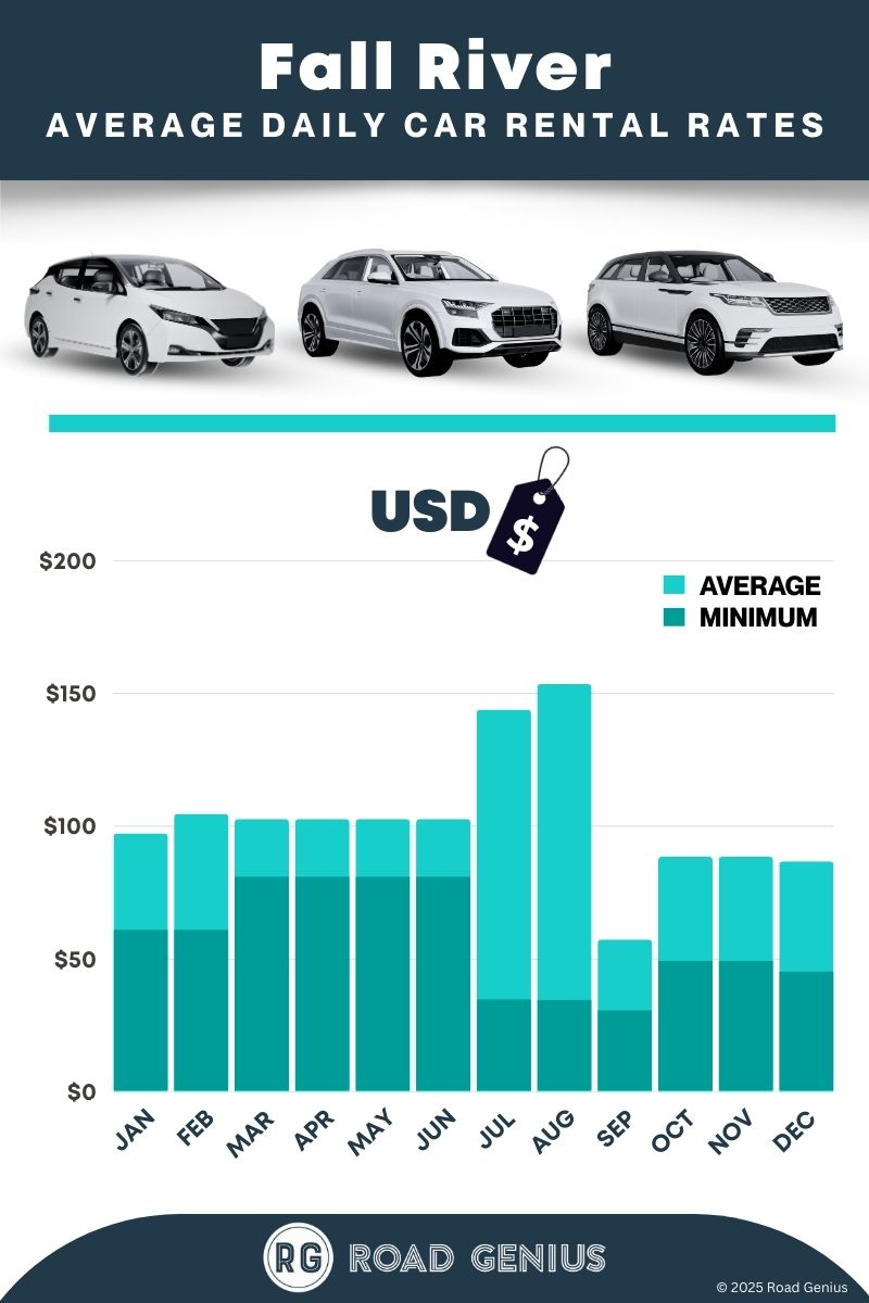 On average, car rentals in Fall River cost around $86 per day, with the lowest-priced rentals starting at $30 per day.