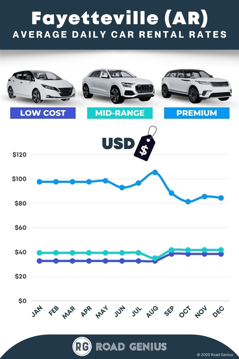 On average, car rentals in Fayetteville (AR) cost around $56 per day, with the lowest-priced rentals starting at $33 per day.
