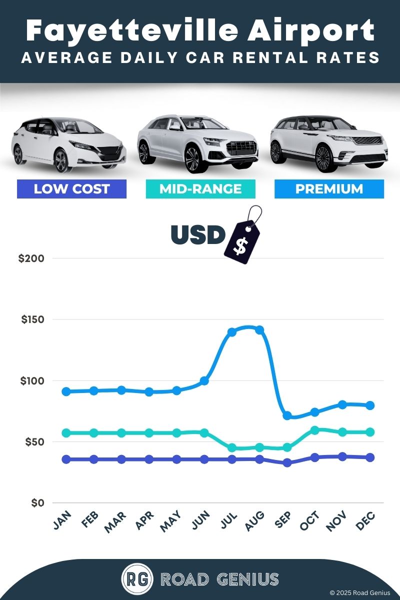On average, car rentals at Fayetteville Airport cost around $62 per day, with the lowest-priced rentals starting at $33 per day.