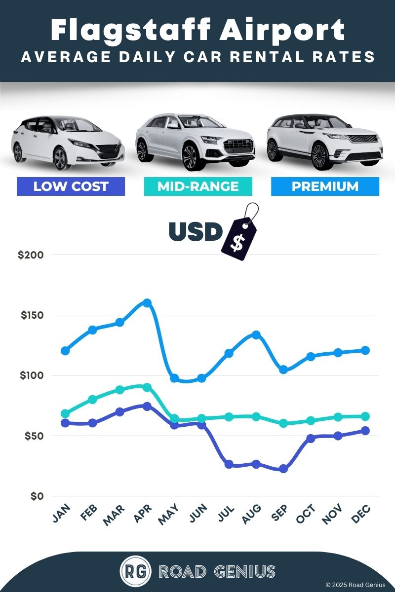 On average, car rentals at Flagstaff Airport cost around $81 per day, with the lowest-priced rentals starting at $23 per day.