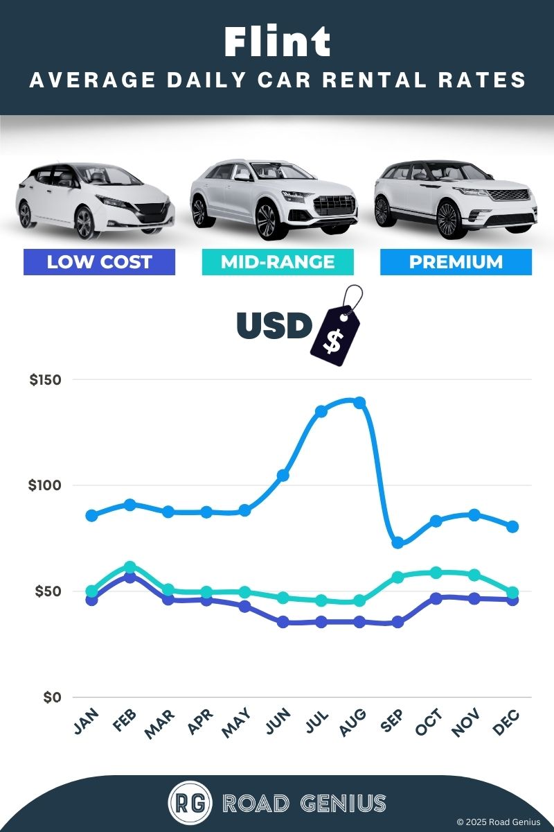 On average, car rentals in Flint cost around $63 per day, with the lowest-priced rentals starting at $36 per day.