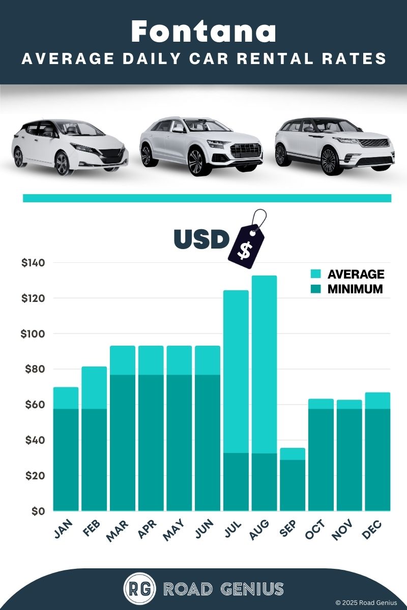 On average, car rentals in Fontana cost around $75 per day, with the lowest-priced rentals starting at $29 per day.