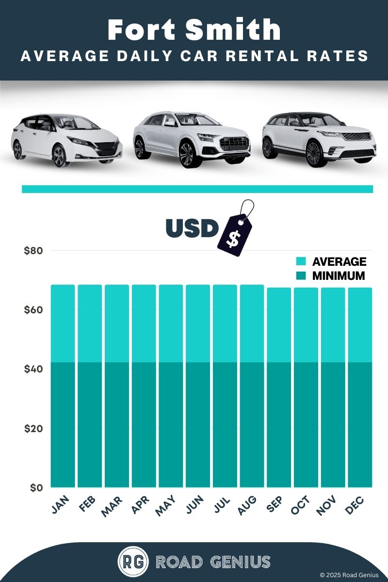 On average, car rentals in Fort Smith cost around $62 per day, with the lowest-priced rentals starting at $42 per day.