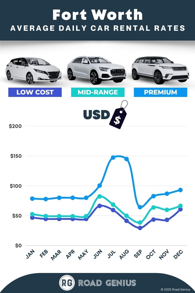 On average, car rentals in Fort Worth cost around $66 per day, with the lowest-priced rentals starting at $30 per day.