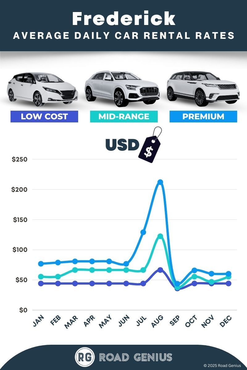 On average, car rentals in Frederick cost around $65 per day, with the lowest-priced rentals starting at $36 per day.