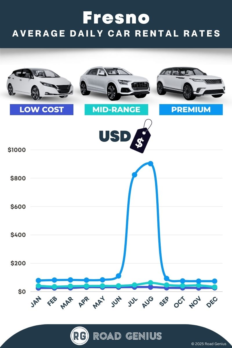 On average, car rentals in Fresno cost around $95 per day, with the lowest-priced rentals starting at $26 per day.