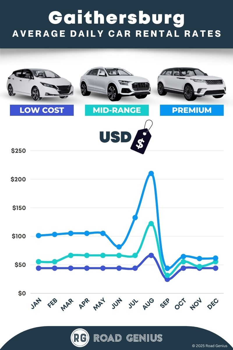 On average, car rentals in Gaithersburg cost around $68 per day, with the lowest-priced rentals starting at $25 per day.