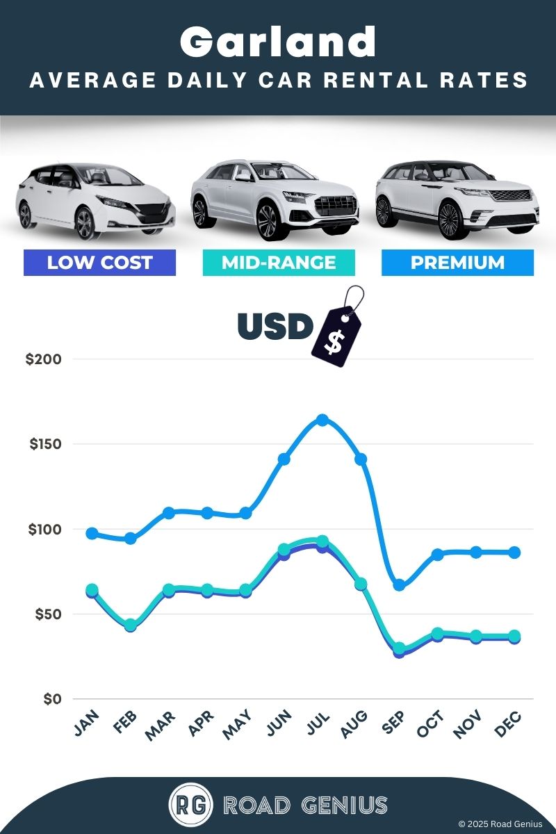 On average, car rentals in Garland cost around $74 per day, with the lowest-priced rentals starting at $27 per day.