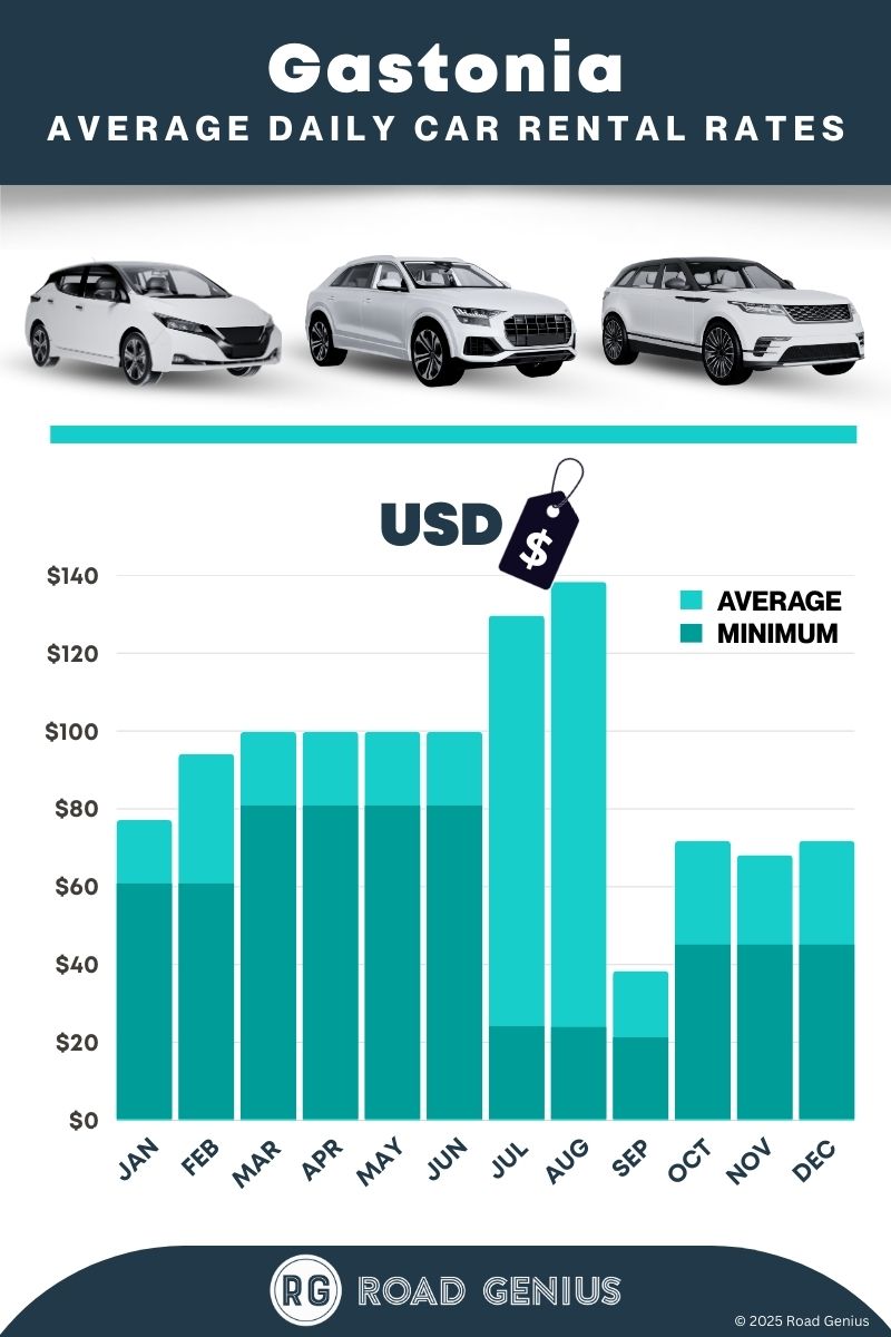 On average, car rentals in Gastonia cost around $78 per day, with the lowest-priced rentals starting at $21 per day.