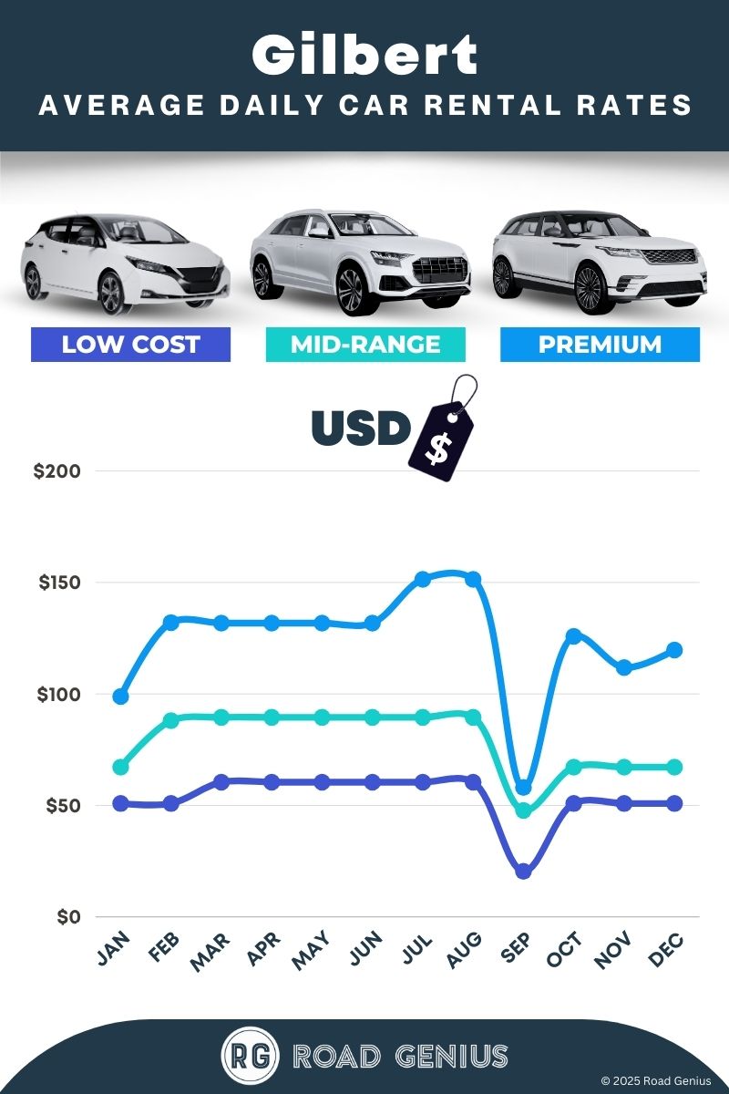 On average, car rentals in Gilbert cost around $85 per day, with the lowest-priced rentals starting at $20 per day.