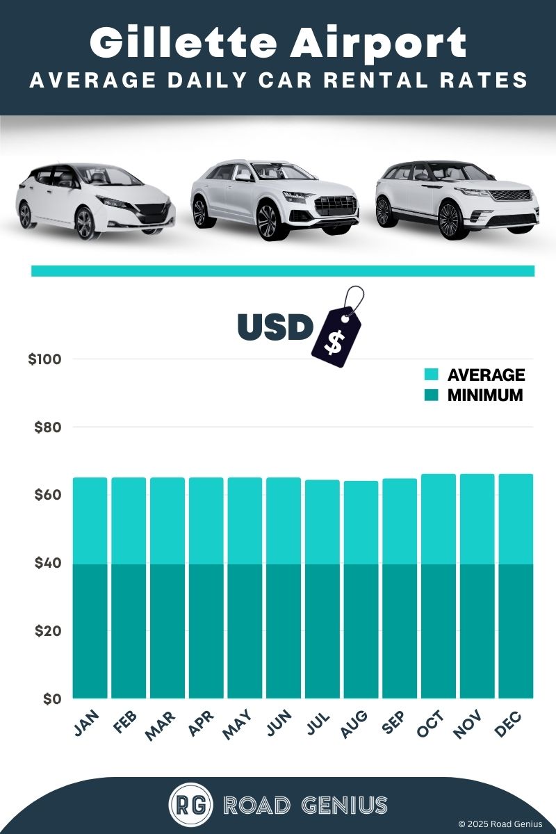 On average, car rentals at Gillette Airport cost around $63 per day, with the lowest-priced rentals starting at $39 per day.