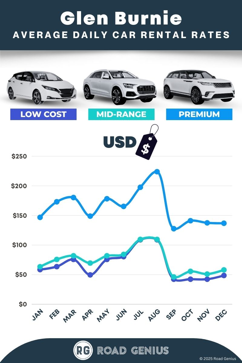 On average, car rentals in Glen Burnie cost around $101 per day, with the lowest-priced rentals starting at $42 per day.