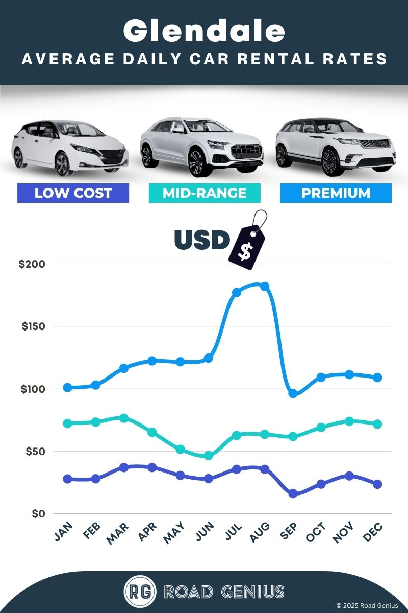 On average, car rentals in Glendale cost around $73 per day, with the lowest-priced rentals starting at $16 per day.