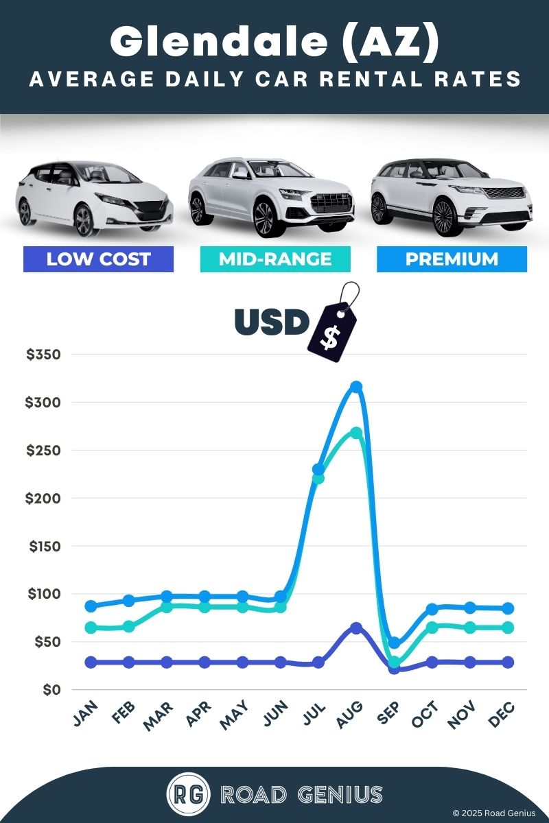 On average, car rentals in Glendale (AZ) cost around $83 per day, with the lowest-priced rentals starting at $22 per day.