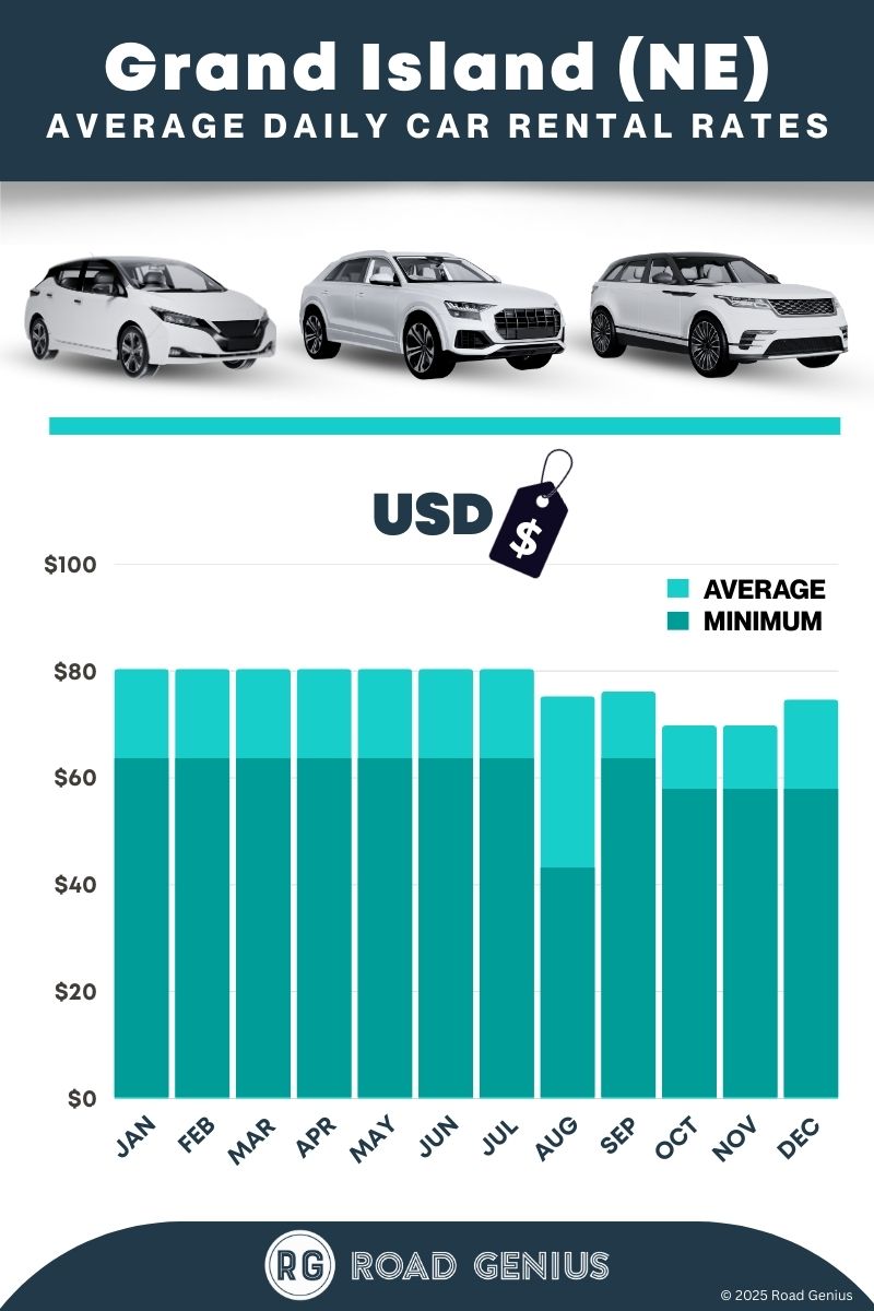 On average, car rentals in Grand Island (NE) cost around $70 per day, with the lowest-priced rentals starting at $43 per day.