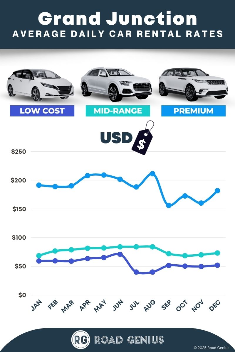 On average, car rentals in Grand Junction cost around $107 per day, with the lowest-priced rentals starting at $40 per day.