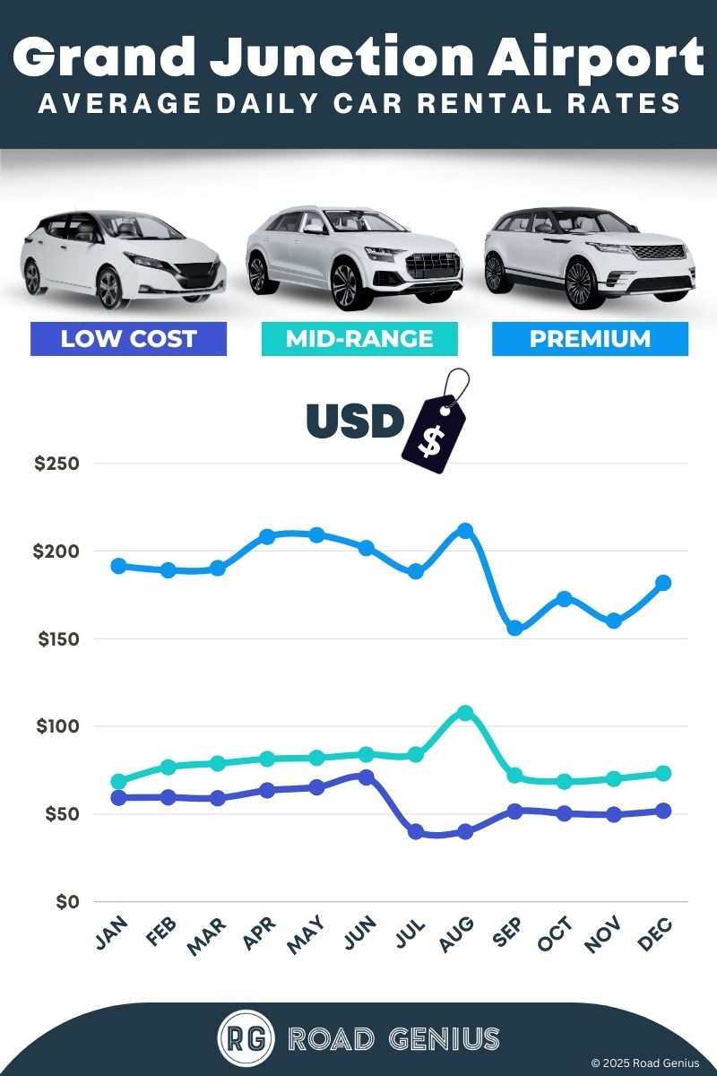 On average, car rentals at Grand Junction Airport cost around $107 per day, with the lowest-priced rentals starting at $40 per day.