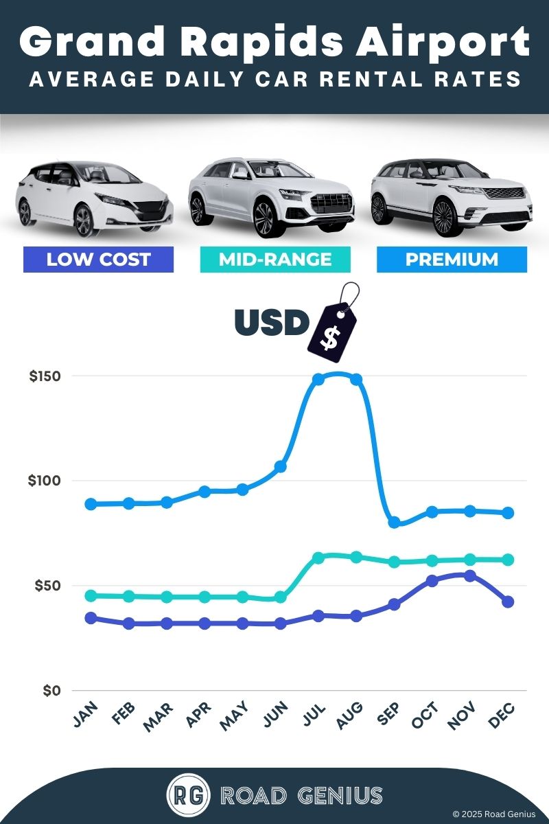 On average, car rentals at Grand Rapids Airport cost around $64 per day, with the lowest-priced rentals starting at $32 per day.