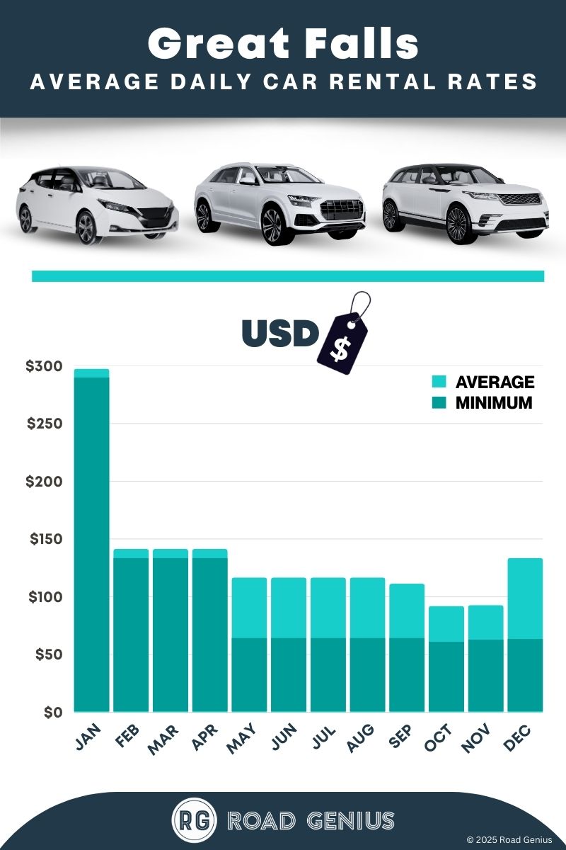 On average, car rentals in Great Falls cost around $96 per day, with the lowest-priced rentals starting at $60 per day.
