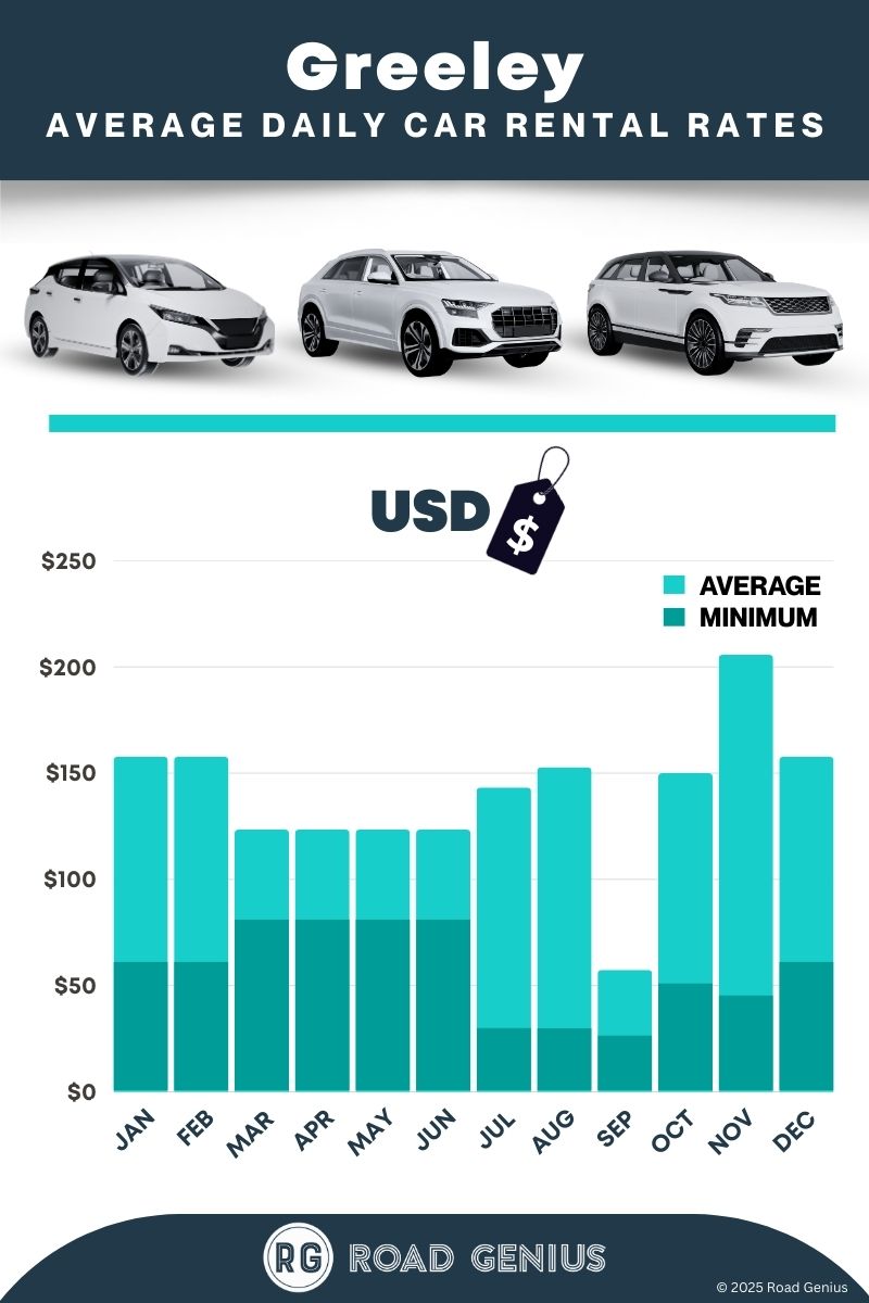 On average, car rentals in Greeley cost around $86 per day, with the lowest-priced rentals starting at $26 per day.