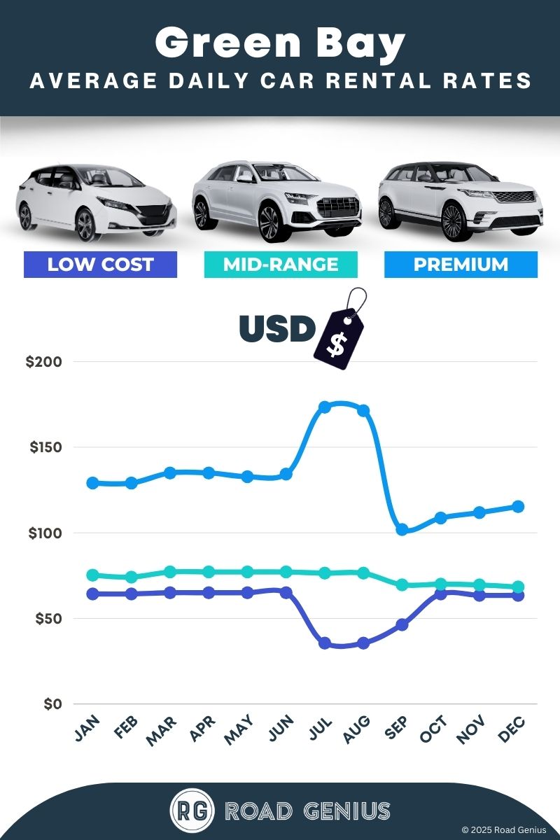 On average, car rentals in Green Bay cost around $90 per day, with the lowest-priced rentals starting at $60 per day.